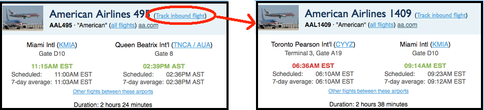 When flying, you know that if your incoming plane is delayed, your flight won’t be leaving on time. How can you check this? Simply visit www.flightaware.com to check your flight’s status, and look for the “Track Inbound Flight” link, which will show you the status of your incoming plane. In this example, the inbound plane for American Flight 495 from Miami to Aruba is coming from Toronto (American Flight 1409).